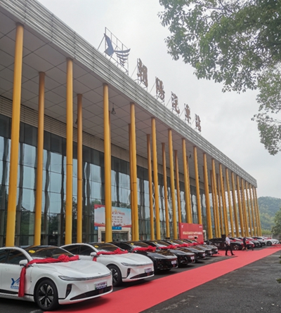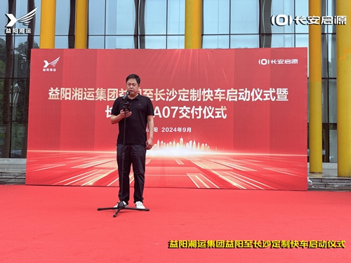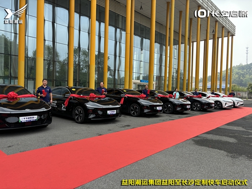 9月3日上午9時28分,朝陽汽車站前坪整齊停放了14臺掛上大紅綢的新能源長安啟源A07純電動車。這是益陽湘運集團益陽至長沙定制快車啟動儀式暨長安啟源A07純電動車交付儀式現場。